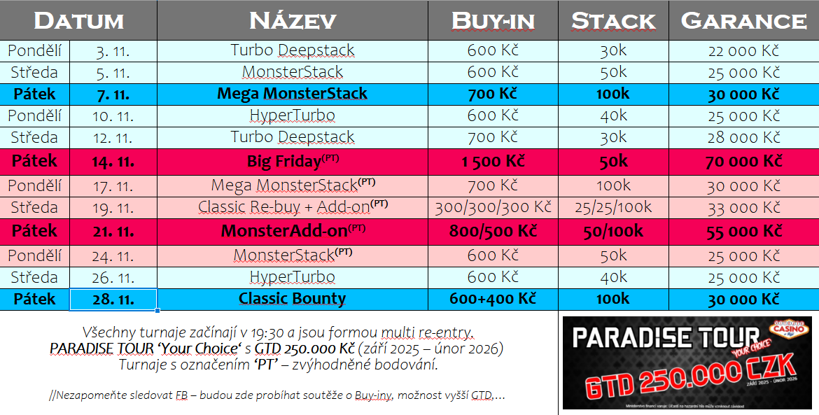Nové turnaje Soutěže o Buy-iny, Rebuy, možnost vyšších GTD,... Budeme se těšit na Vaši návštěvu Tým Casina v Ráji PS: choďte včas, vyplatí se to